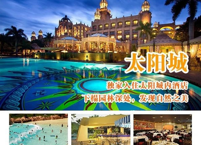 酒店早餐。前往機場,搭乘航班飛往約堡。驅車前往南半球最大的娛樂中心-太陽城。不曾身臨其境,便無法真正理解太陽城給人所帶來的震撼。將古老傳說的神秘滄桑、非洲大陸的野性粗獷和現代生活的便利舒適那樣完美地融合在一起。你可以在失落城探尋非洲大陸上最古老的秘密,根據神話傳說興建的地震橋以及豪華賭場、著名的建筑-失落城等。這里有清幽的湖光山色,無數的珍禽異草,游人可漫步其中享受。(含自由活動游覽時間約3小時) 晚餐后,入住太陽城內豪華酒店,您可于太陽城內賭場大顯身手。溫馨提示:約堡-太陽城,約210公里,車程約3小時